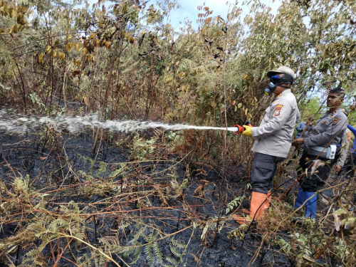 SELATPANJANG – Kapolres Kepulauan Meranti, AKBP Taufiq Lukman Nurhidayat SIK MH meninjau lokasi terjadinya kebakaran hutan dan lahan (karhutla) di Desa Telesung, Kecamatan Rangsang Pesisir, pada Rabu (26/2/2020). Dalam kesempatan itu, Kapolres Taufiq ikut membantu melakukan pemadaman.