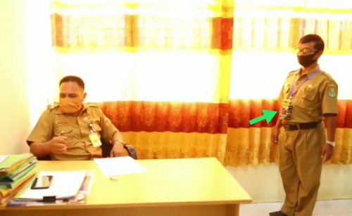 SIAK – Pemerintah Kecamatan Dayun, Kabupaten Siak, Riau membuat inovasi baru dalam penerapan New Normal di lingkungan kerja. Selama bekerja atau pun melayani masyarakat, seluruh pegawai kantor Camat Dayun menggunakan ‘Senjata’ yang dikalungkan di leher.