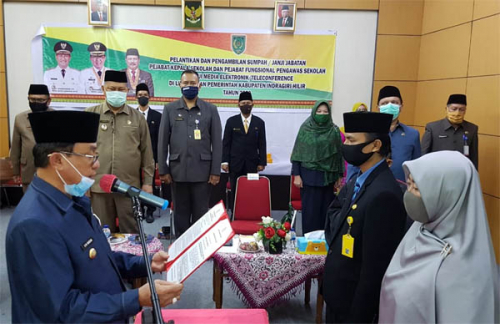 TEMBILAHAN – Bupati Kabupaten Indragiri Hilir (Inhil), HM Wardan melantik 210 Pejabat Kepala Sekolah dan Pejabat Fungsional Pengawas Sekolah se-Kabupaten Inhil, Jumat (12/6/2020). Pelantikan yang dibarengi pengambilan sumpah jabatan dilaksanakan secara virtual oleh Bupati di Kantor Diskominfops Kabupaten Inhil, Tembilahan.