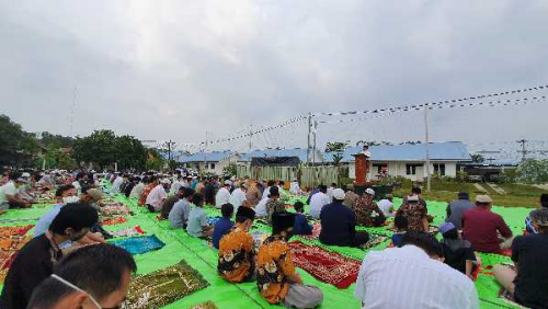 Ribuan karyawan dan keluarga terlihat khusyuk dan mematuhi protokol kesehatan dalam melaksanakan sholat ied yang digelar di empat masjid di Riau Kompleks, Jumat (31/7/2020), Pangkalan Kerinci, Pelalawan, Riau.