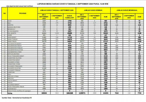 PEKANBARU – Satuan Tugas Penanganan Covid-19 telah merilis perkembangan terkini penanganan kasus Covid-19 di Indonesia. Yang mana pada Kamis (3/9/2020) sore, kasus terkonfirmasi positif Covid-19 di Indonesia mencapai 184.268 orang.
