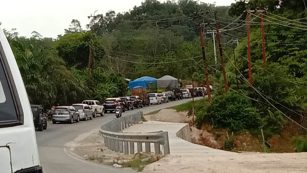 BANGKINANG – Macet panjang terjadi di jalan lintas Riau – Sumbar akibat amblasnya separo badan jalan di kilometer 93 Desa Tanjung Alai, XIII Koto Kampar, Riau, Rabu (28/10/2020). Dari siang hingga malam ini, macet panjang masih terjadi karena ada pengaturan lalu lintas dengan sistem buka tutup.