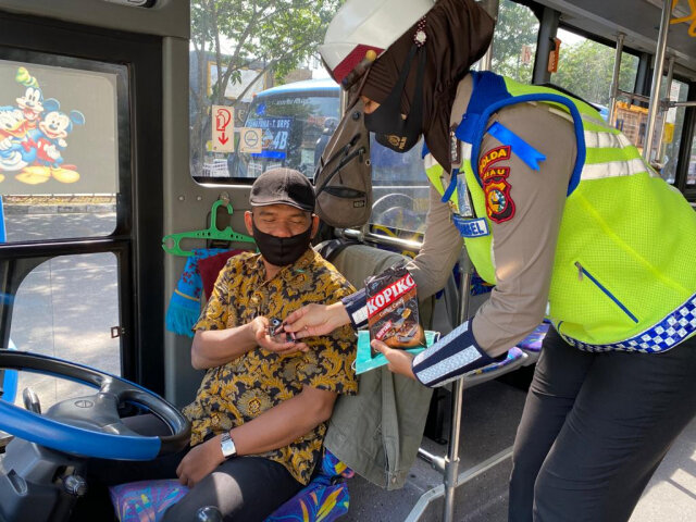 Tidak hanya membagikan masker, para Polantas juga memberikan permen kopi kepada pengendara mobil bus Trans Metro Pekanbaru, dengan tujuan memberikan semangat bagi supir yang tengah bekerja, dan pendekatan kepada masyarakat.
