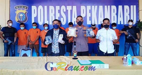 PEKANBARU – Aparat kepolisian dari Satresnarkoba Polresta Pekanbaru mengamankan 4.492 butir pil ekstasi dan 2 kilogram sabu yang dibungkus plastik teh cina. 9 orang kurir turut diringkus.